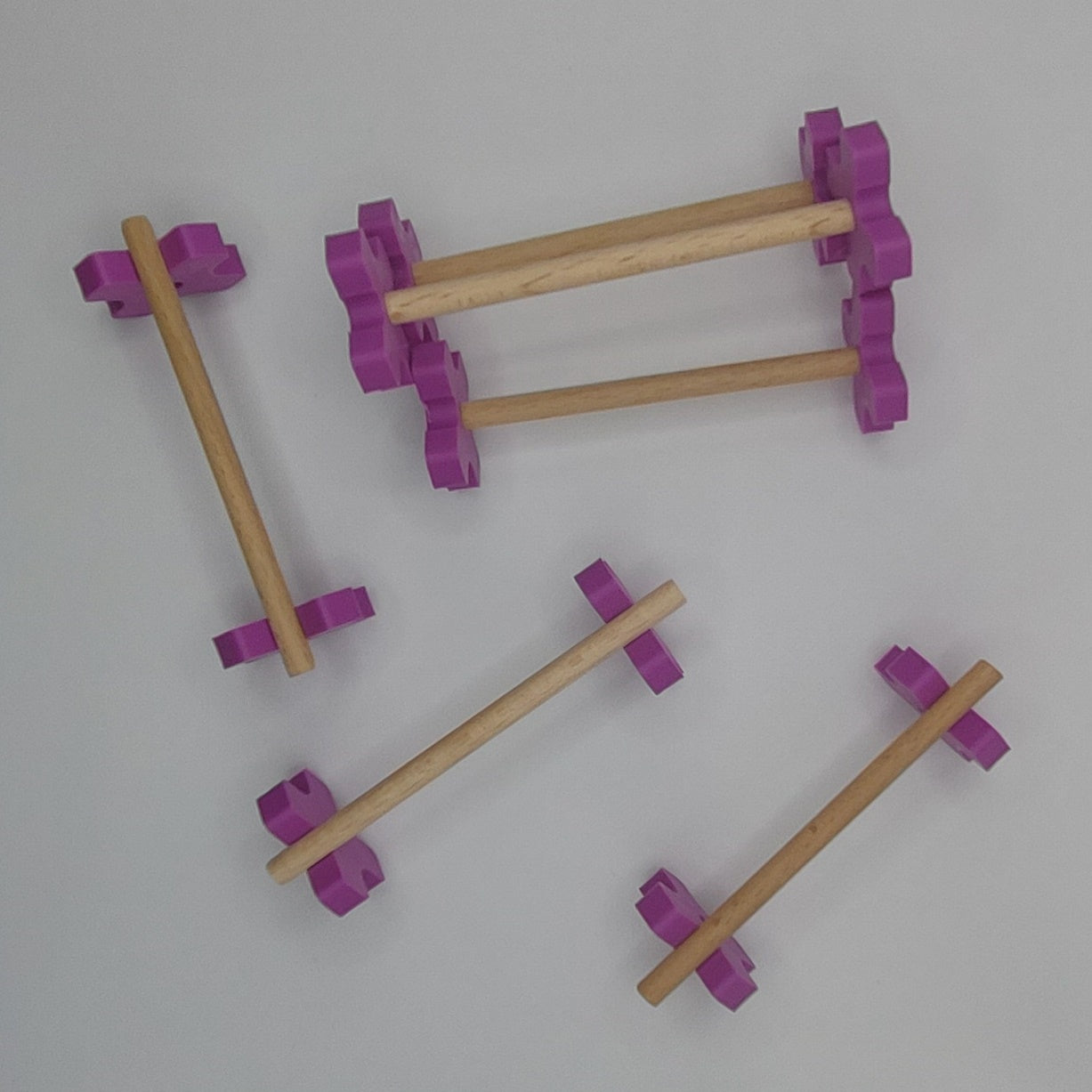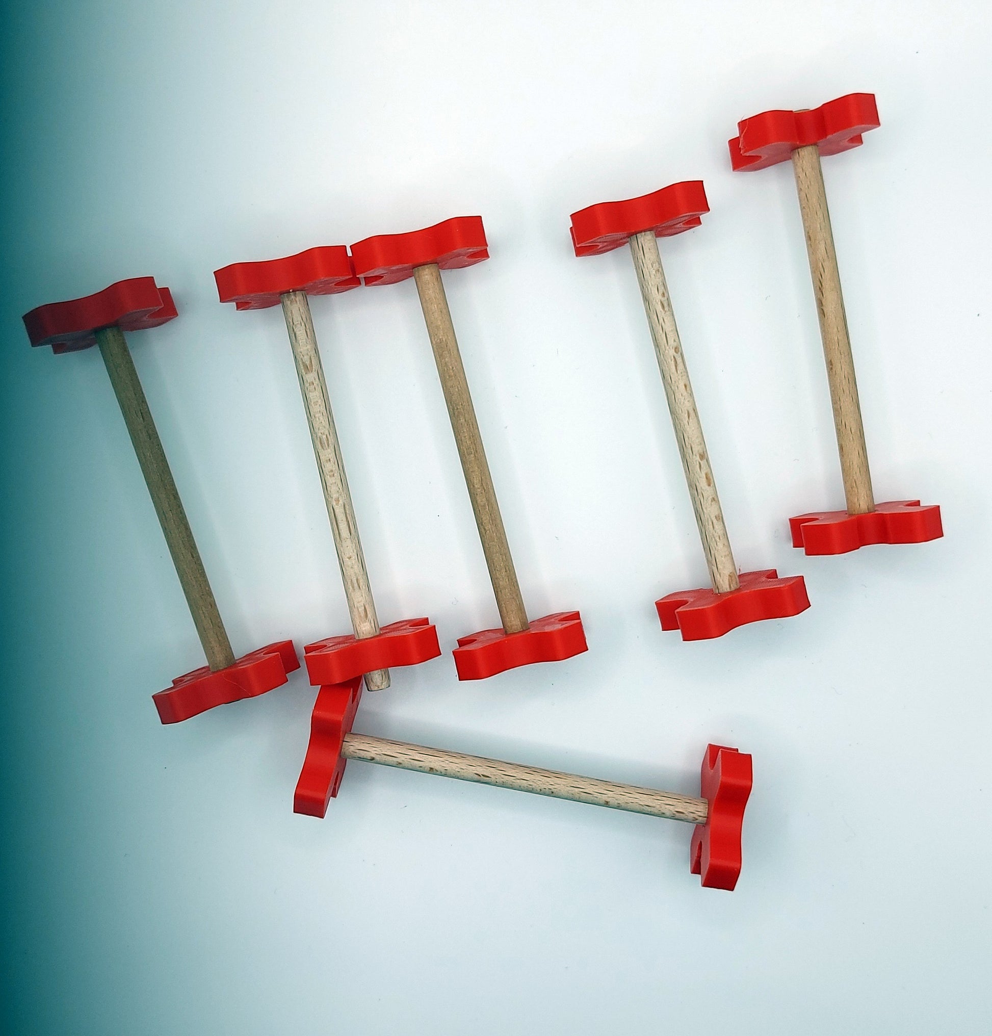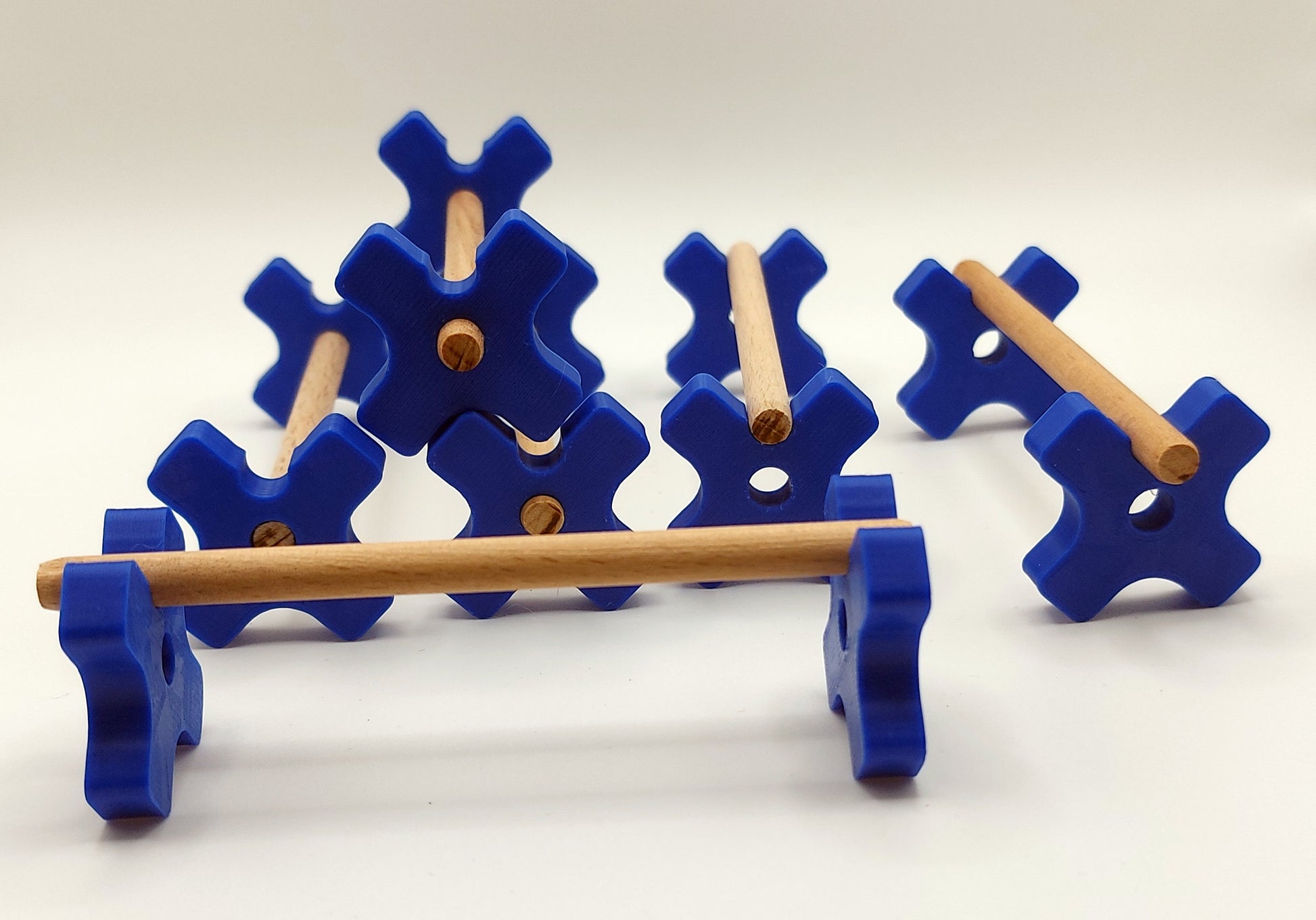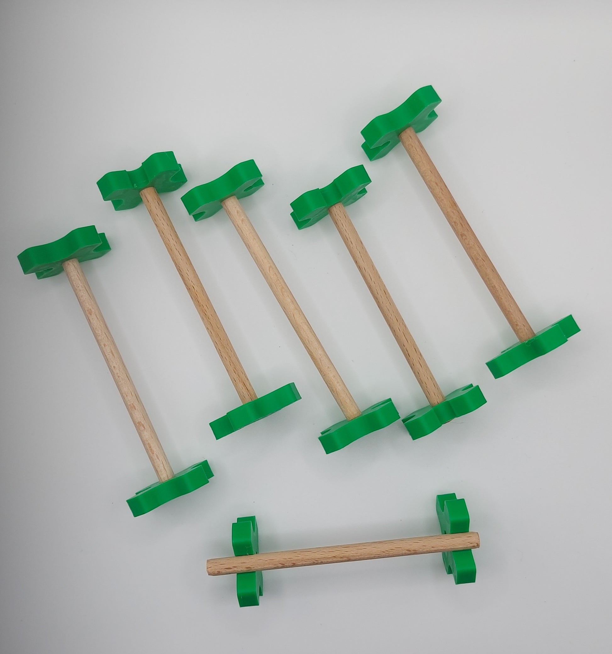 Die leichten Stangen aus Holz sind stabil und doch federleicht zu stapeln, sodass kleine Turnierparcours im Handumdrehen entstehen.